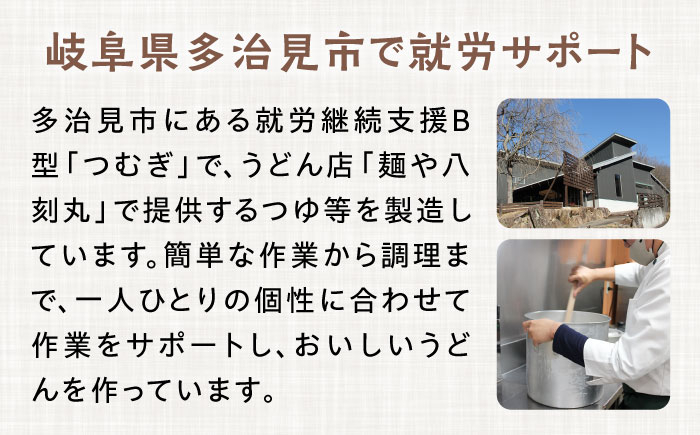 ■岐阜県多治見市で就労サポートをしています岐阜県多治見市にある就労継続支援B型「つむぎ」では、材料を袋から出したり野菜を洗ったりの簡単な作業から、材料を切るなどの調理まで、一人ひとりの障がいの特性、個性に合わせて作業内容を決めています。ひとりひとりの個性に合わせて作業をサポートし、人気のおいしいうどんをお作りしています。「つむぎ」で作ったうどんは、名古屋市のセミセルフうどん店「麺や八刻丸」で提供されています。