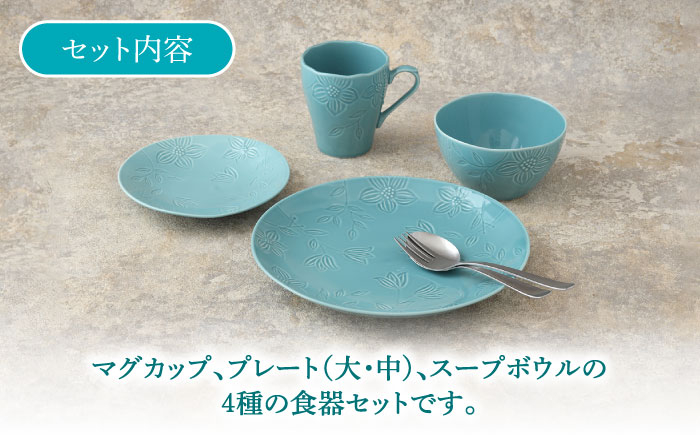 おしゃれな花柄で食卓が華やぐ 【美濃焼】 マグカップ プレート スープボウル 食器 4点 セット フローラル ターコイズ 【丸半製陶所】 [TDG014]