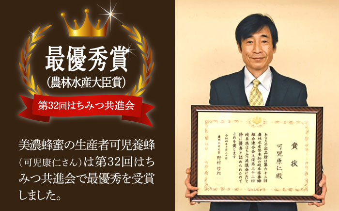 美濃蜂蜜の生産者、可児養蜂(可児康仁)さんは岐阜県養蜂組合連合会主催、第32回はちみつ共進会にて最優秀の農林水産大臣賞を受賞しました。