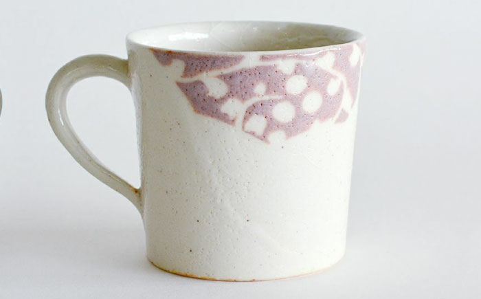美濃六銘窯の一つ仙太郎窯にて制作された、志野唐草文マグカップ(横柄)です。
