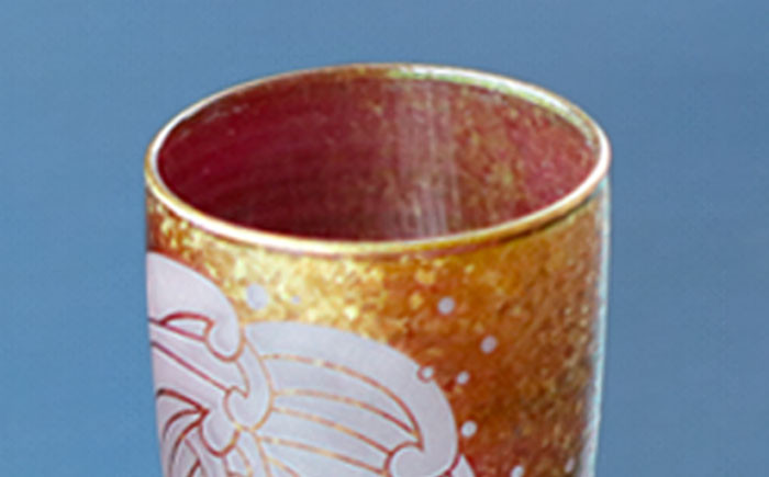 このグラスは外側表面にインフロスト(結晶状の模様をグラス本体に閉じ込める特殊加工)を施し、さらに筆を使って金銀銅の顔料を塗装した後、焼成して仕上げました。
