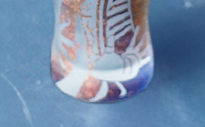 このグラスは外側表面にインフロスト(結晶状の模様をグラス本体に閉じ込める特殊加工)を施し、さらに筆を使って金銀銅の顔料を塗装した後、焼成して仕上げました。
