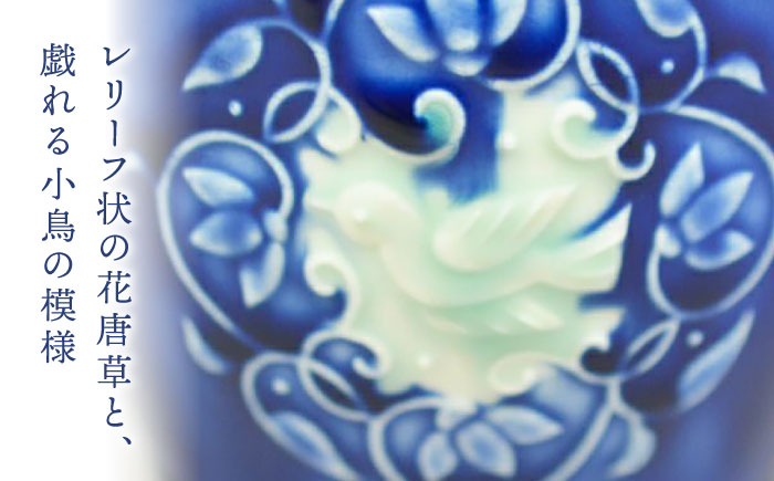 青色の釉薬と高台に巻かれたゴールド、レリーフ状の花唐草と、戯れる小鳥が上品な印象。
