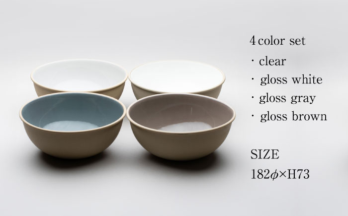 | 容量 | ■ボウル ×4 サイズ:径18.2×高7.3cm 容量:700ml クリア・グロスホワイト・グロスグレイ・グロスブラウン(各1点) 【対応機器】 電子レンジ○ / オーブン○ / 食洗機○ |