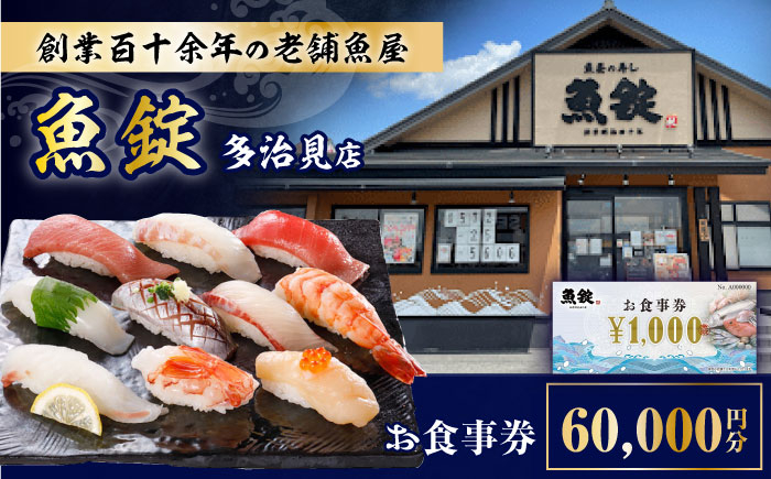 創業明治40年、老舗魚屋が提供するお寿司や料理がご堪能できます。 魚錠 多治見店 お食事券 60,000円分 多治見市 [TGG006]