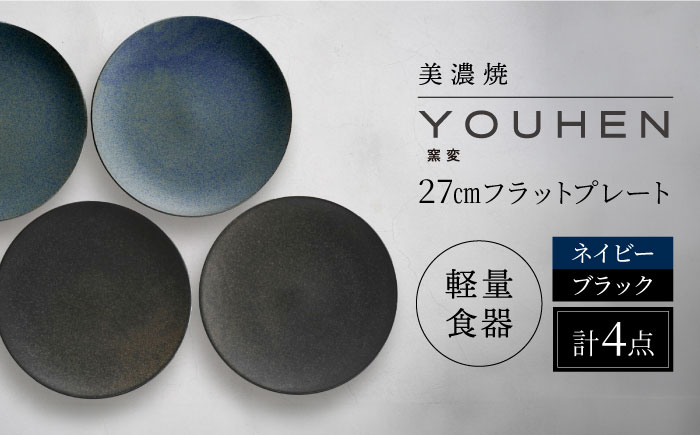 窯の中で複雑に変化する色合い、美濃の手仕事を感じられる唯一無二のうつわ。 【美濃焼】[軽量食器] YOUHEN 27cmフラットプレート 4枚セット (ネイビー×2 ブラック×2 ) 多治見市 / 井澤コーポレーション 食器 プレート 皿 [TBP220]