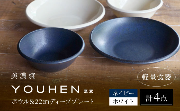 窯の中で複雑に変化する色合い、美濃の手仕事を感じられる唯一無二のうつわ。 \レビューキャンペーン実施中!!/【美濃焼】[軽量食器] YOUHEN ボウル & 22cm ディーププレート×2 ペアセット (ホワイト/ネイビー) 多治見市 / 井澤コーポレーション 食器 プレート 皿 [TBP227]