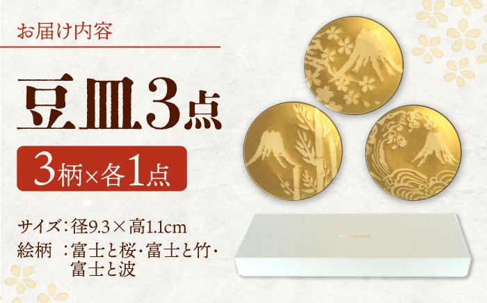 | 容量 | 【セット内容】 ■豆皿 ×3柄 (富士と桜・富士と竹・富士と波)各1 計3点 【サイズ】 径9.3×高1.1cm 【対応機器】 電子レンジ○ / オーブン× / 食洗機○ 【原料原産地】 岐阜県産 【加工地】 多治見市 |