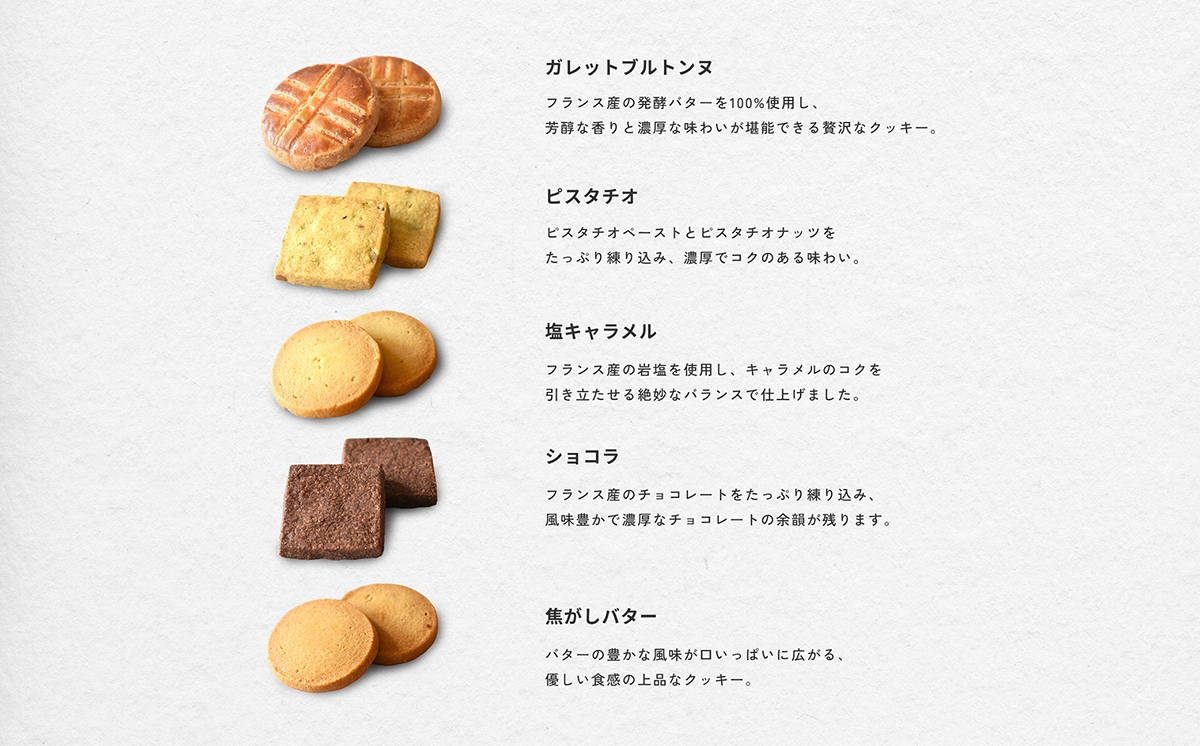 フレッシュバターを使用して、妥協なく丁寧に作られたクッキーの詰め合わせ。