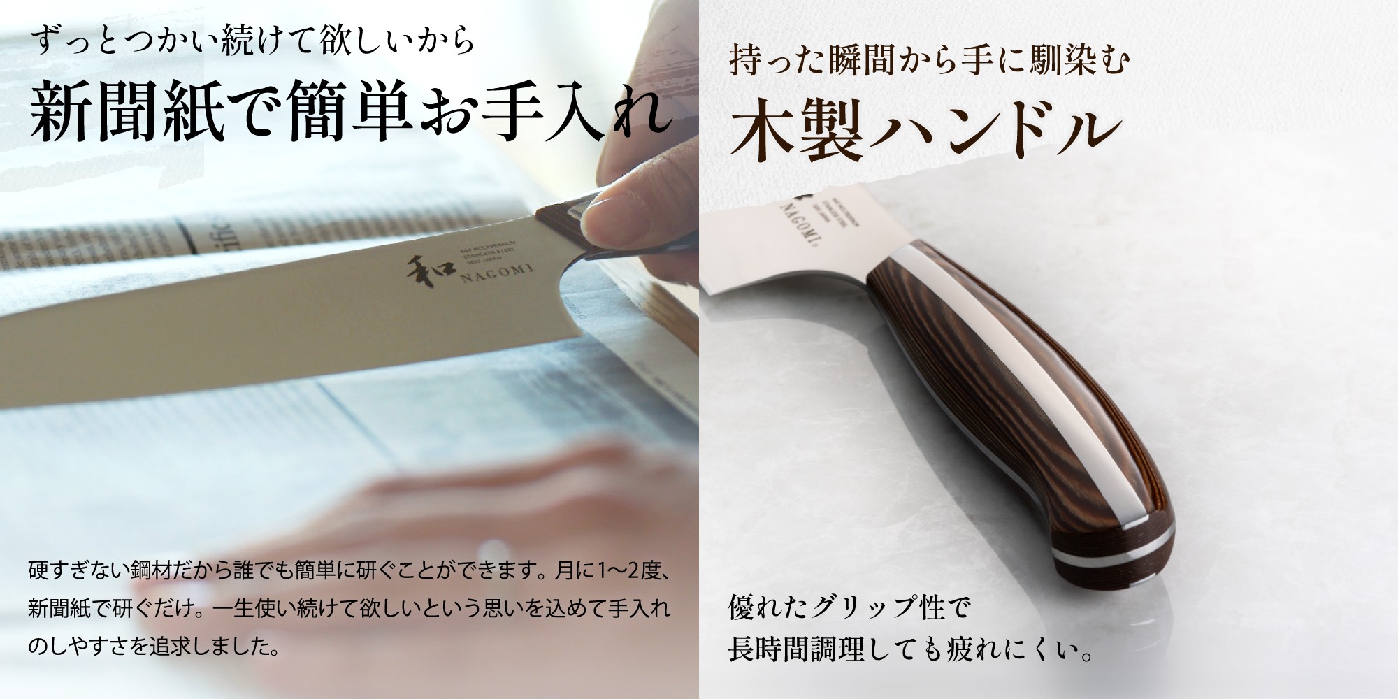 【三徳】 三徳は読んで字のごとく、“肉”、“魚”、“野菜”を切れることが由来の日本の万能包丁。 「和 NAGOMI」の三徳包丁は切れ味が鋭く、ハンドルに段差がないので手とひとつになる様なグリップ感。 一つひとつが職人の手作業によるものです。 長時間の使用でも疲れにくく、美しいデザインは毎日のお料理をより楽しくしてくれます。 【パン切り包丁】 切ることの難しい焼きたてフワフワの食パンから、思わず刃こぼれが心配になる硬いバゲットまでを、この1本で。 特徴的なナミ刃が生地の引っ掛りをなくし、パンくずがこぼれにくく、綺麗にカットすることができます。 【ペティ】 通常のペティナイフよりも少し大きめの「和 NAGOMI」のペティナイフ。 様々なお料理にお使いいただける、ユーティリティ・ナイフとして手早く済ませたい“ちょっとしたお料理”をする際にもとても便利です。 もちろん、小回りが利くので、皮を剥く・飾り切りなどに重宝します。 提供元:三星刃物株式会社 関の刃物 / 包丁 / ホウチョウ / 庖丁 / 家庭用 / キッチンナイフ / キッチン用品 / キッチンツール / キッチン雑貨 / 台所 / 料理 / 料理道具 / 料理グッズ / 調理グッズ / 使いやすい / 調理器具 / 調理用品 / 切れる / 切れ味 / 長持ち / おしゃれ / かっこいい / 刃物製品出荷額全国1位 / 日本一の刃物のまち / 伝統工芸技術 / 職人 ・ 匠の技 / 人気 / 有名 / 名産 / 万能 / ブランド / 三徳 / 三徳包丁 / 万能包丁 / 文化包丁 / 包丁 / 関の三徳包丁
