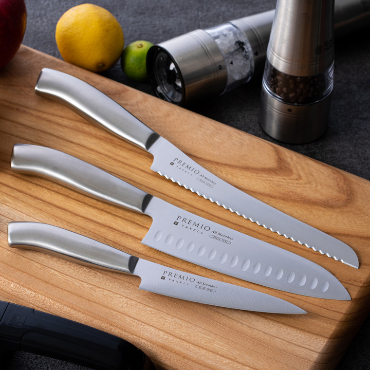 チョイスPayポイントと交換できる品 ステンレス製の一体型で衛生的 ディンプル加工により食材の切り離れ抜群 プレミオAS 包丁3点セット (三徳包丁 パン切り包丁 ペティナイフ) オールステンレス 31831000002 一体型 包丁セット ブレッドナイフ 果物ナイフ シャープナー ステンレス おしゃれ キッチン用品 贈り物 ギフトにも
