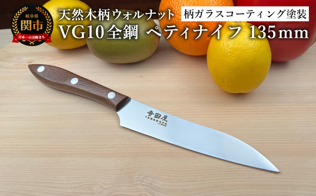 チョイスPayポイントと交換できる品 オールVG10鋼の鋭い切れ味、天然木柄の丸み帯びた優しい手触りのペティナイフ 関寺田屋 ペティナイフ 135mm VG10全鋼 天然木柄 ウォルナット 柄ガラスコーティング塗装/ナイフ 包丁 オールVG10鋼材 オールステンレス キッチンナイフ キッチン用品 調理器具 日本製