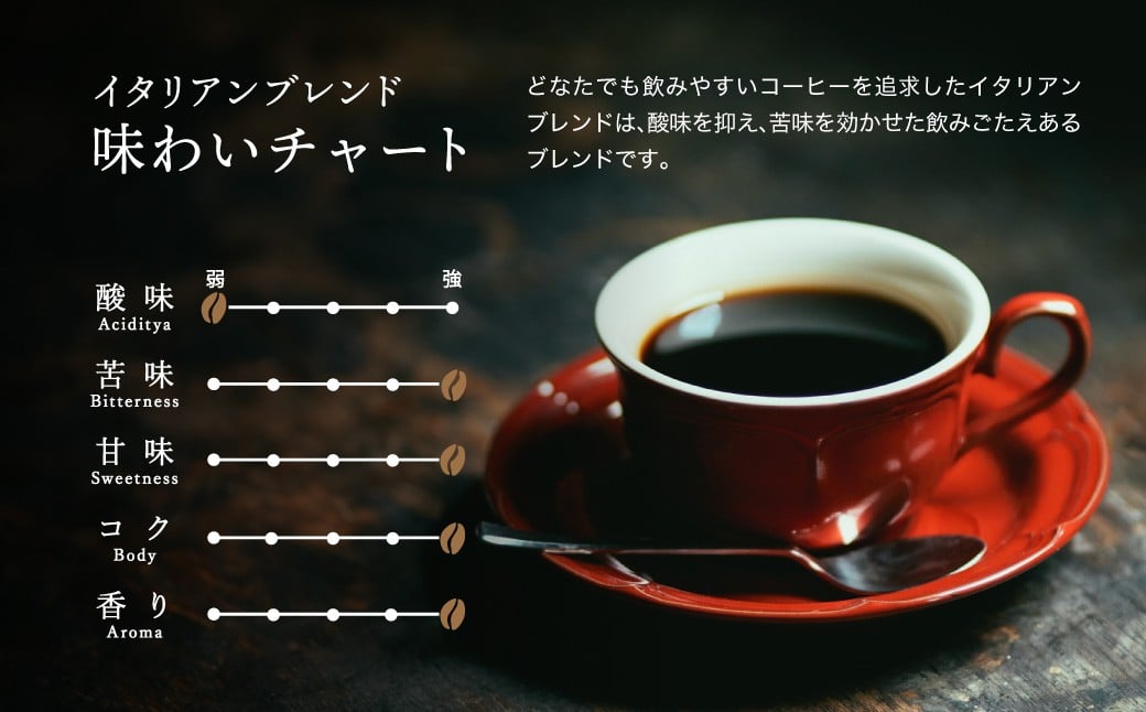 こちらの商品は、酸味を抑えて、苦味を効かせた深煎りの「イタリアンブレンド」を、ドリップバッグにしました。