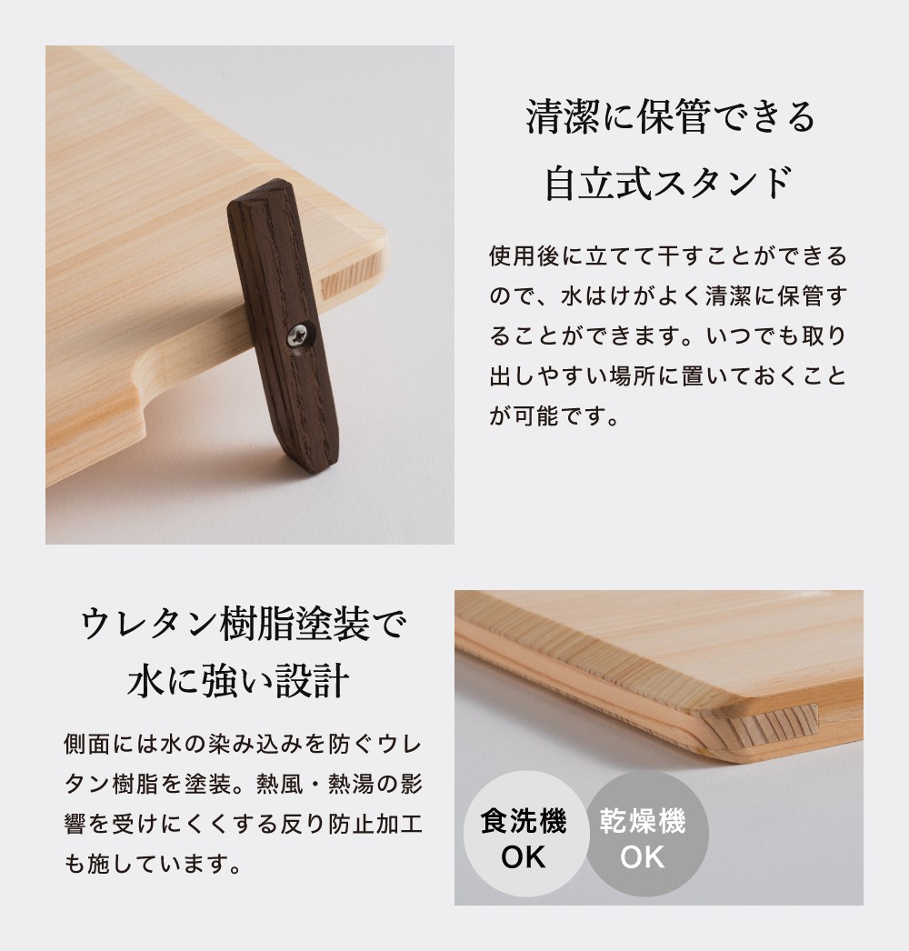 ・刃物メーカーならではの視点で設計した、包丁に優しい桧まな板。