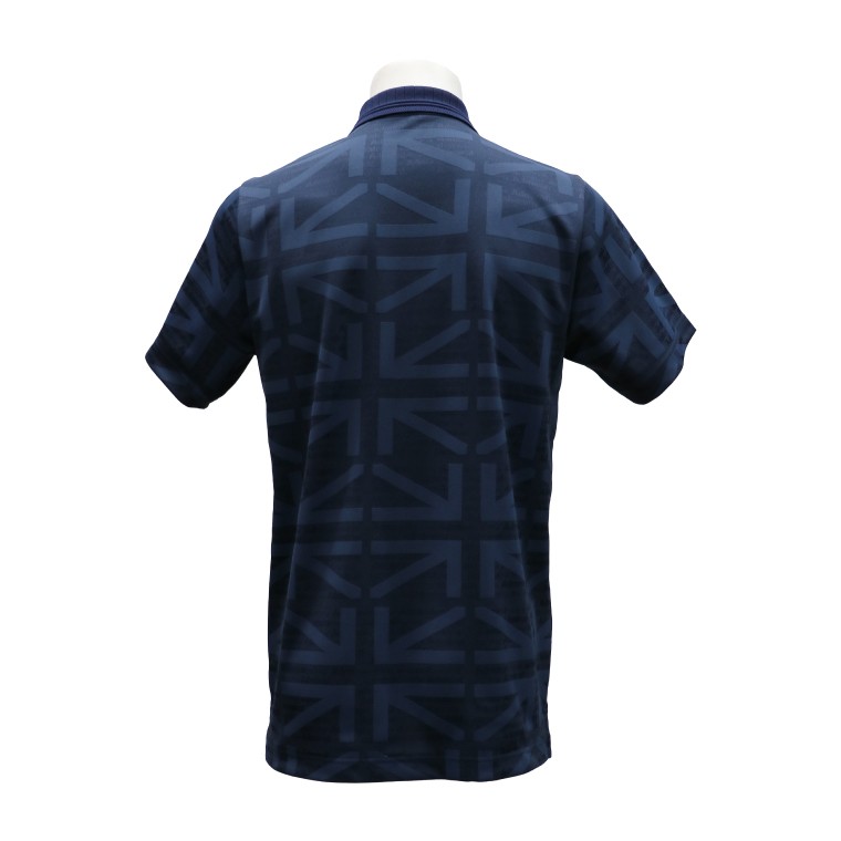 日本製のネイビーカラーLサイズゴルフウェア1枚です。北陸産地で丁寧に編み上げられた高級ジャカード素材を使用し、機能糸『CEOa』を織り込むことで素早く汗を吸収・発散し、衣服内を快適に保ちます。凹凸のあるジャカード編みでユニオンジャック柄を繊細に表現し、シンプルな前立てロゴが洗練された印象を与えます。動きやすさと快適な着心地を兼ね備え、ゴルフプレーに最適です。