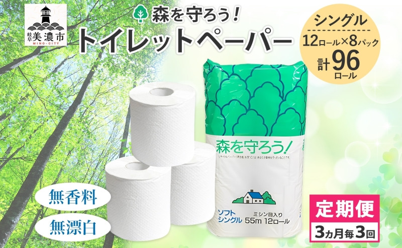 [№5308-0007]定期便 3ヶ月毎 全3回 トイレットペーパー 森を守ろう 55m シングル 計96ロール 12ロール×8袋 紙 ペーパー ソフト 日用品 消耗品 厚手 衛生用品 備蓄 岐阜県 美濃市