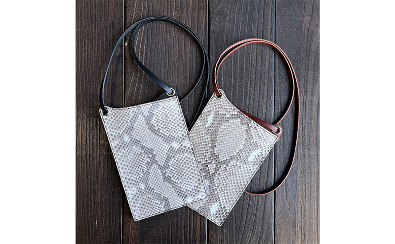 上品なマット仕上げのダイヤモンドパイソンレザーと 栃木レザーの贅沢な組み合わせで、シンプルなスマホショルダーを作りました。