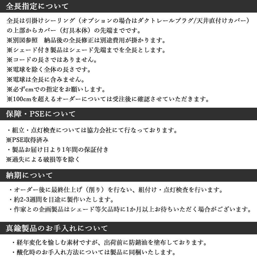 | 容量 | ■お礼品の内容について ・金属と木工職人が作り上げるシーリングライト SQUARE【Keyaki×クロム加工 E-26】[615g/1個] 原産地:岐阜県瑞浪市/製造地:岐阜県瑞浪市/加工地:岐阜県瑞浪市 ■原材料・成分 素材:鉄 size:43×43×H130(mm) 重量:615g(本体のみ。電球含まず) 全長:60cm(天井より本体まで。電球含まず) ※コードアジャスター付属 備考:E26 60Wまで LED電球対応 ※10W電球1個が付属します。 ※※シーリングの種類と長さが選択可能です※※ お申込み時、必ず備考欄にご希望をご記入ください。 1.シーリングの種類を下記からお選びください 引掛けシーリング/ダクトレールプラグ/天井直付けカバー/フランジカップ(樹脂)/フランジカップ(真鍮) 2.ご希望の全長(cm)をご記入ください 全長とはシーリングの上部からカバー(灯具本体)の先端までです。 【加工地】 瑞浪市 |