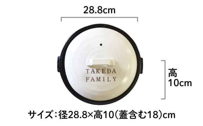 | 容量 | ■名入れオーダー土鍋9号 ×1 サイズ:径28.8×高10(蓋含む18)cm 素材:陶器 ■名入れについて ・「〇〇〇+FAMILY」とお入れします。 ・〇〇〇部分は10文字までです。 ・アルファベット大文字表記のみです。 ・返信用紙に、間違いのないようサインペンなどで太めの文字でお書きください。 ・ラッピングや配送先情報などもそちらの用紙に項目がございます。ご指示をお願いいたします。 【対応機器】 電子レンジ△ / オーブン△ / 食洗機△ ※・IHプレートを入れた状態での電子レンジは使用不可 ・オーブン、食洗機は下の部分のみ使用可能(蓋はNGです) 【原料原産地】 岐阜県産 【加工地】 岐阜県瑞浪市 |