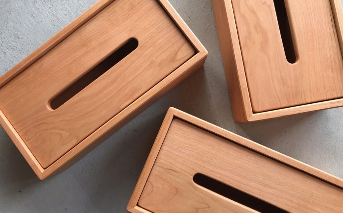 ティッシュボックスは、ひと続きの材で製作しているので木目が繋がっており、蓋と底板は厚材をスライスして材取りをし、丁寧に製作しています。