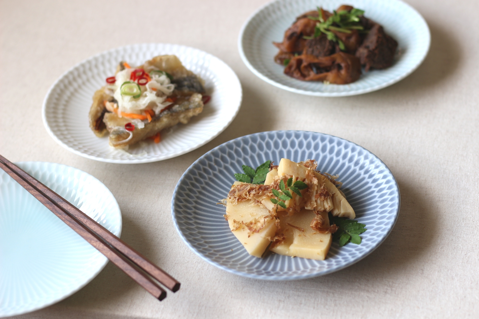 波打ち際を思わせる、伝統的なしのぎ文様のレリーフが料理をやさしく彩る華やかな器。