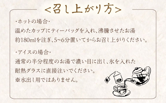 温めたカップにティーバッグを入れ、沸騰させたお湯約180mlを注ぎ、5~6分置いてからお召し上がりください。