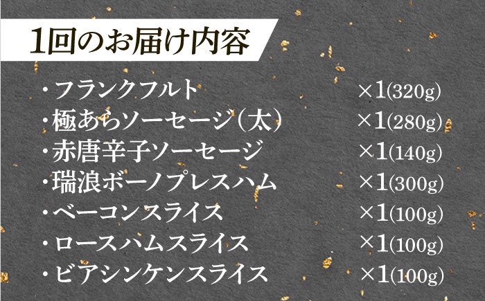 | 容量 | ■下記を12か月連続でお届けします。 ・フランクフルト[320g] ・極あら【太】[280g] ・赤唐辛子ソーセージ[140g] ・瑞浪ボーノプレスハム[300g] ・ベーコンスライス[100g] ・ロースハムスライス[100g] ・ビアシンケンスライス[100g] ※掲載写真はすべてイメージです。 【加工地】 岐阜県瑞浪市 |