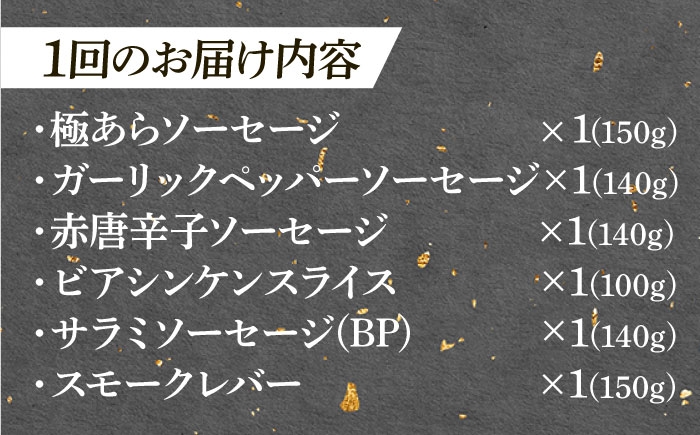| 容量 | ■下記を6か月連続でお届けします。 ・極あらソーセージ[150g] ・ガーリックペッパーソーセージ[140g] ・赤唐辛子ソーセージ[140g] ・ビアシンケンスライス[100g] ・サラミソーセージ(BP)[140g] ・スモークレバー[150g] ※掲載写真はすべてイメージです。 【加工地】 岐阜県瑞浪市 |