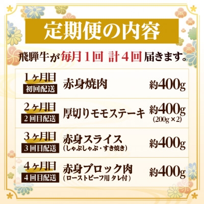 <毎月定期便>飛騨牛 赤身定期便 計1.6kg 焼肉 BBQ すき焼き しゃぶしゃぶ ブロック全4回【4072648】