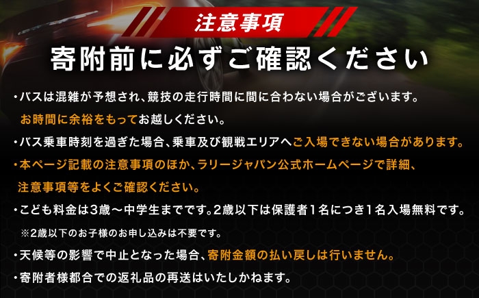 ・競技や会場の都合上、SS走行時間、観戦エリア、駐車場の開場時間、バスの発着時間など、予告なく変更となる可能性があります。