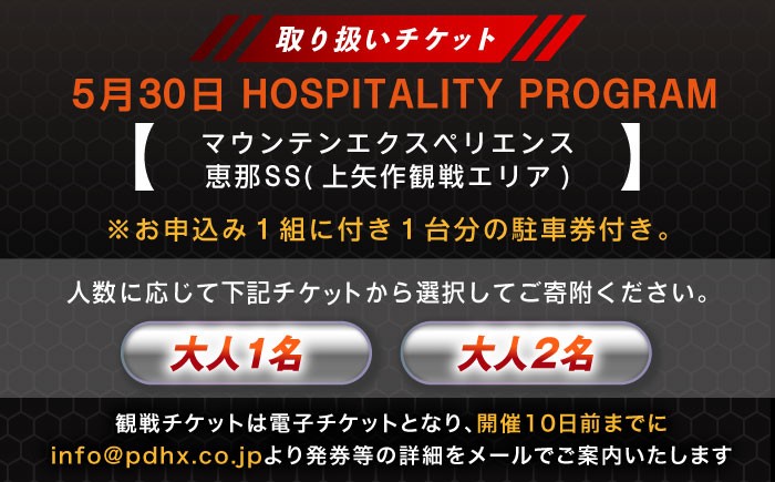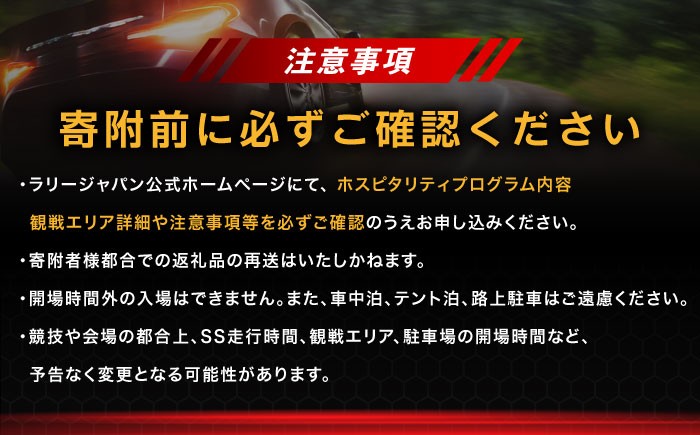 | 容量 | ■お礼品の内容について ラリージャパン【HOSPITALITY PROGRAM マウンテンエクスペリエンス恵那SS(上矢作観戦エリア)】5月30日(土)観戦チケット ■注意事項 ・ラリージャパン公式ホームページにて、ホスピタリティプログラム内容、観戦エリア詳細や注意事項等を必ずご確認のうえお申し込みください。 ・SS(スペシャルステージ)観戦時間や車の入出庫時間には制限があります。競技等の最新スケジュールはラリージャパン公式ホームページにてご確認ください。 ・徒歩での移動が多い為歩きやすい服装・履物でお越しください。 ・手荷物のお預かりは出来ませんのでご了承ください。 ・お申込み1組に付き1台分の駐車券付き。 ・観戦チケットは電子チケットとなり、開催10日前までにinfo@pdhx.co.jpより発券等の詳細をメールでご案内いたします ・この返礼品は、恵那市にお住まいの方はお申込みいただけません。 ・天候及びほかの不可抗力による中止、または諸条件により競技が成立せず、該当の競技コース(SS)が中止となった場合も、寄附金額の払い戻し、代替品の発送はいたしかねます。予めご了承の上、お申し込みください。 ※中止の場合でも、所定の手続きを行うことで所得税や住民税の還付・控除は受けられます。 ・配送先情報の変更や長期ご不在日がございましたら、事前に恵那市ふるさと納税サポート室までご連絡ください。 ※この寄附は、WRC・恵那ラリーを活用したまちづくり事業に使われます。 |