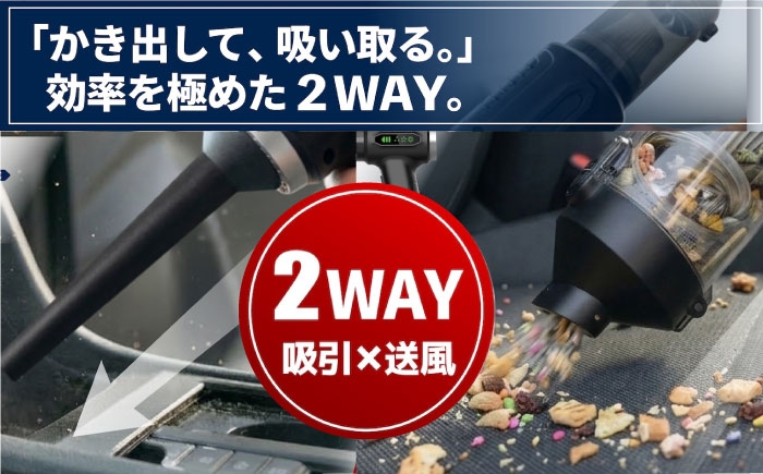 さらに本製品は「吸引+送風」の2WAY仕様。通常の吸引清掃だけでなく、エアブロー機能によりエアコン吹き出し口やスイッチ周辺などの細かな隙間に入り込んだホコリを吹き出し、そのまま吸引できます。車内掃除機としてだけでなく、洗車後の水滴飛ばしや細部清掃にも活躍します。