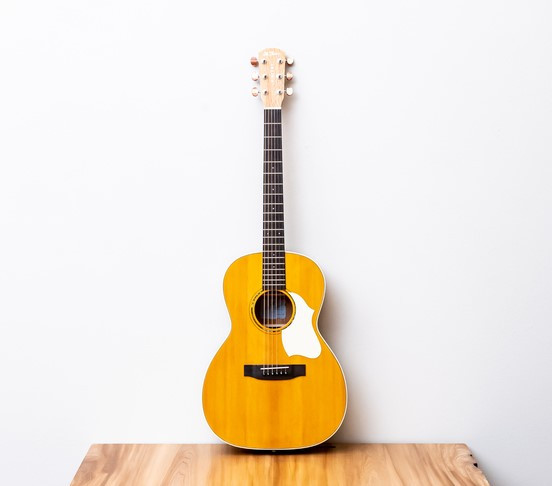 ヘッド・ストックには美濃加茂市内で伐採されたアベマキを採用し、その雰囲気に合わせたヴィンテージホワイトのピックガードが気品ある柔らかさを演出します。