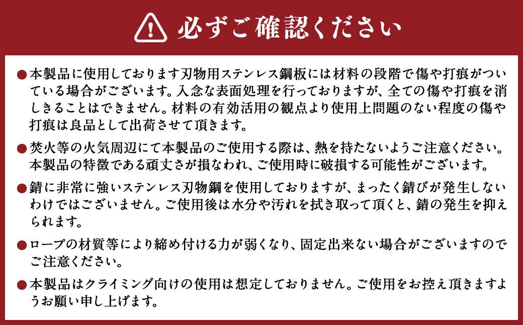 ◇本製品に使用しております刃物用ステンレス鋼板には材料の段階で傷や打痕がついている場合がございます。入念な表面処理を行っておりますが、全ての傷や打痕を消しきることはできません。材料の有効活用の観点より使用上問題のない程度の傷や打痕は良品として出荷させて頂きます。