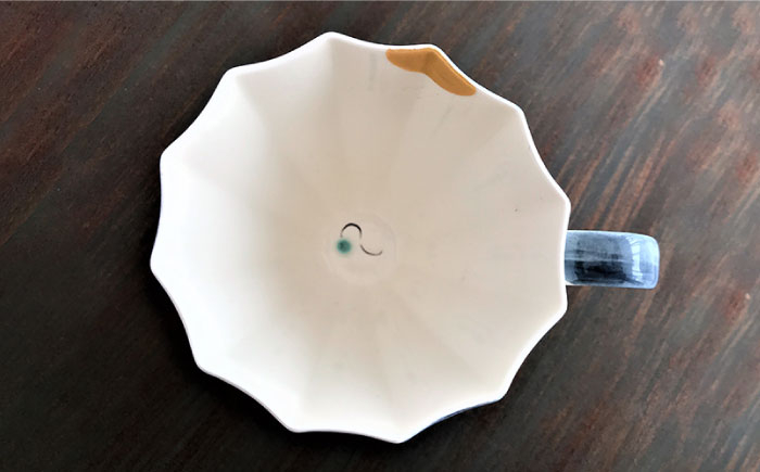 星座は、ロマンチックで癒されるモチーフ。どちらのシリーズも老若男女問わずご好評いただいております。カップの底に金彩の名入れをするサービスは、世界にひとつだけの私だけのカップという特別感が贈り物に大変喜ばれています。下絵付けをして、上薬を掛けて本焼成した後に、金彩絵付けをしてから再焼成をして仕上げます。傘をつぼめたような形は見た目に反して口当たりよく飲みやすく暮らしに寄り添うデイリーなマグカップです。マグカップとお揃いの手描きの金印篭箱に入れ、無地の和紙包装でお届けします。
