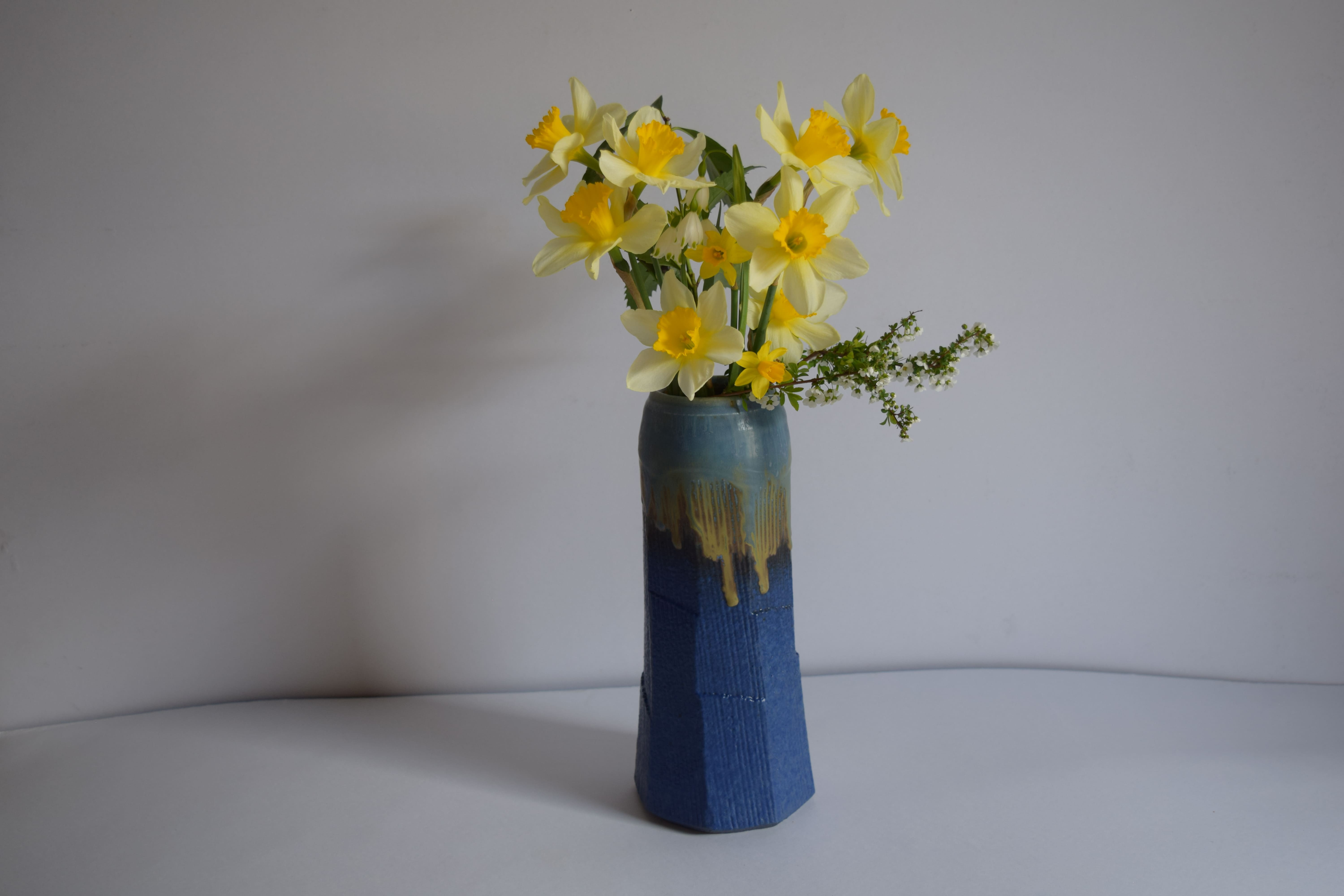 小粒ながら、緊張感漂う力作です。土を力強くカットし、美しい深みのある青彩と窯変した釉調が見事な逸品です。 花を飾るのも良し、器を観るのも良し。ぜひ楽しんでください。