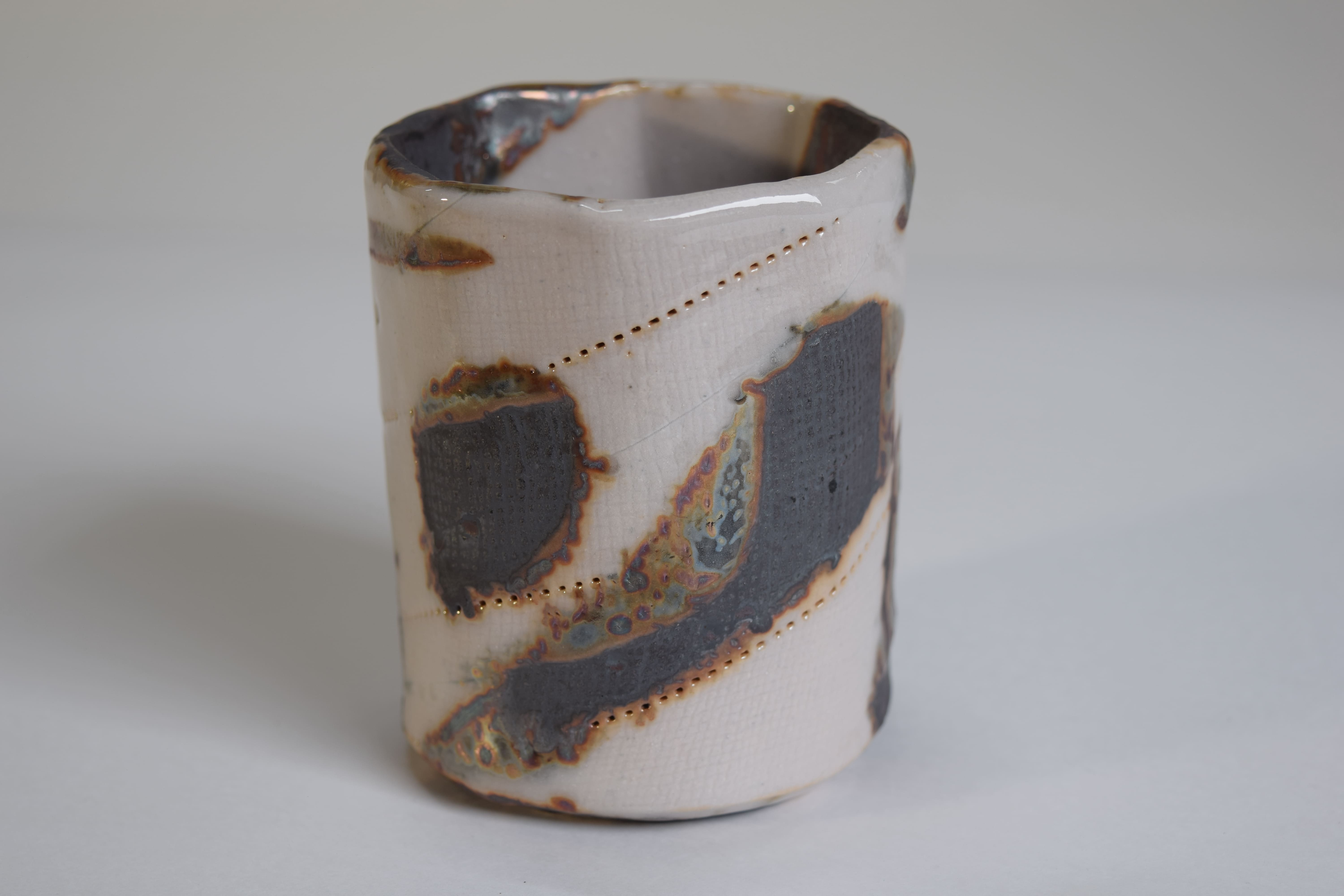 小粒ながら、緊張感漂う力作です。土を力強くカットし、美しい深みのある青彩と窯変した釉調が見事な逸品です。 花を飾るのも良し、器を観るのも良し。ぜひ楽しんでください。