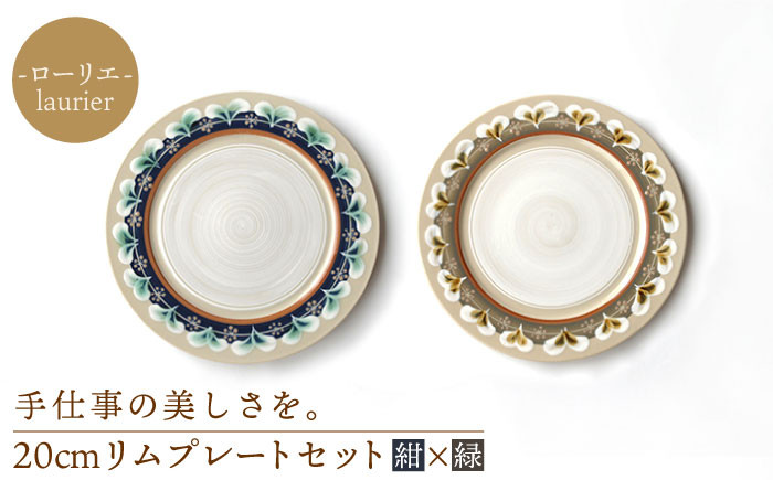 立体感ある絵付、手仕事の美しさを感じる一品 【美濃焼】ローリエ 20cm リムプレート セット(紺・緑)【ふくべ窯】 [MAI009]