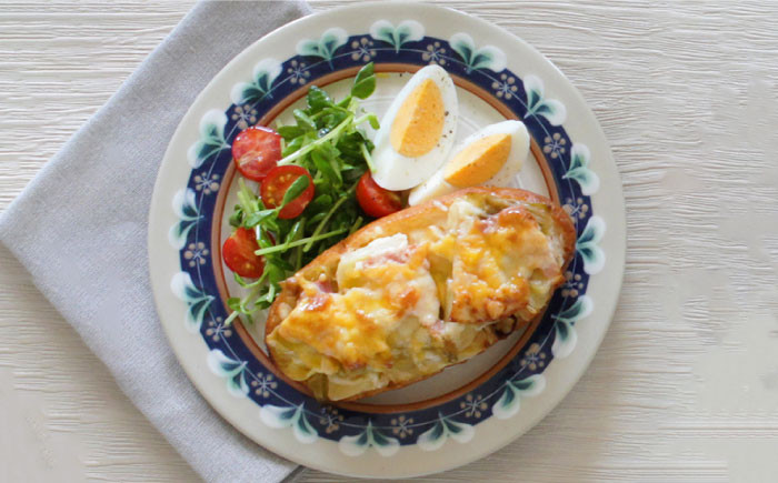 モーニング プレート として、サンドイッチやバゲット、スクランブルエッグなどのお料理をのせて。