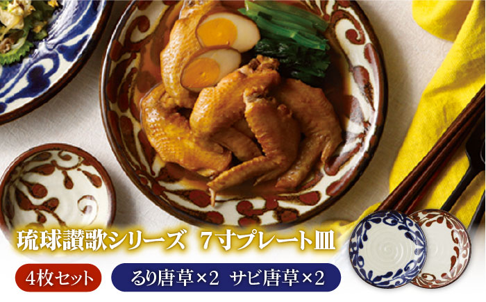 民藝調の素朴でおおらかな空気を持った「琉球讃歌」シリーズ 【美濃焼】琉球讃歌 7.0皿 プレート 4枚セット(るり唐草×2、サビ唐草×2)(昭和製陶)【cierto】食器 大皿 盛皿 [MCD025]