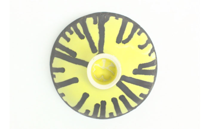 鮮やかなレモンイエローに釉薬による黒いタレは、焼きで仕上がりが異なり、ふたつと同じものはできないという。18cmのボウル。この形は青木良太の代表的な形。個展でも人々を魅了している。