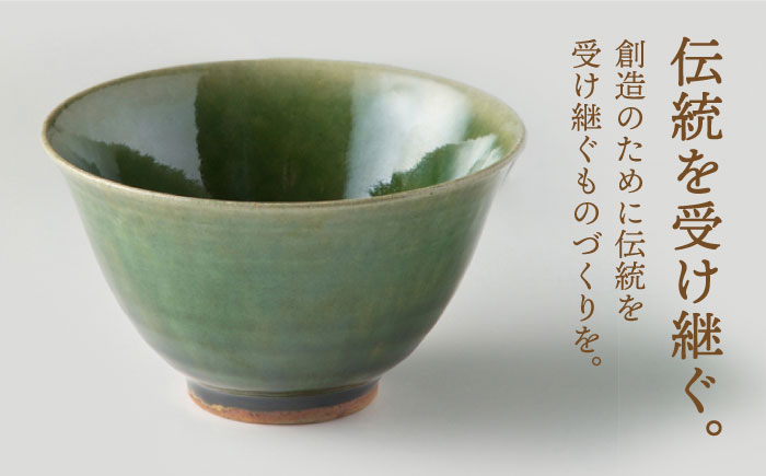 緑釉が生み出す色文様に、艶やかな椿柄が映えるペア茶碗&湯呑