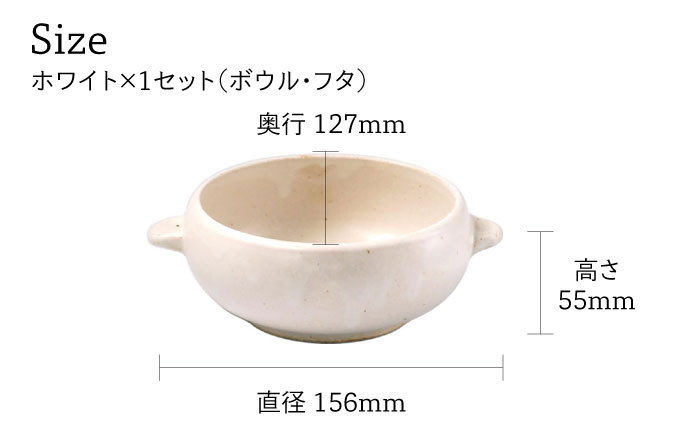 | 容量 | 原産国:日本 産地:岐阜県 土岐市 素材 :美濃焼 陶器 ■パッケージ:化粧箱 ■ボウル本体 ホワイト ×1点 サイズ:15.6×12.7×高5.5cm ■ボウル蓋 ホワイト ×1点 サイズ:径12.3×高1.4cm ■ディッシュ ホワイト ×1点 サイズ:19.6×16.8×高3.1cm 【注意事項/その他】 ※ 電子レンジ・食洗器・オーブン 使用可能 ※ 直火は、ご遠慮下さい。 ※ 本体は割れ物です。磁器よりもかけやすいので、取り扱いにはご注意下さい。 ※ 食品を長時間保存すると、油や水分が器に移り臭いやシミの原因になりますので、ご注意下さい。 ※ 汚れた水に長時間付けることはお避け下さい。 ※ 冷凍庫でのご使用はお避け下さい。冷凍ご飯の解凍には適しておりません。 ※ フタは密閉式ではありません。 ※ 温めた器は熱くなりますので、レンジやオーブンから取り出す際はお気を付けください。 ※ 本商品を置いたときに、テーブルなどが傷つく恐れがあるためご注意下さい。 商品について ※ ひとつひとつ手作業で仕上げているため、個体差があることをご理解のほど宜しくお願い致します。 ※ ホワイトとグレーの釉薬について、その特性上、表面が黄色みを帯びていたり、 焦げのように見える部分がある場合がございます。 ※ 下記の現象については、全カラー共に製造上どうしても発生してしまうため弊社 検品の上、良品としてお届け致します。焼き物の風合いとしてお楽しみ下さい。 ・釉薬垂れ ・ピンホール ・黒点 ・突起 ・貫入 ・へこみ ・不純物 ・釉薬の薄い部分 ・白い斑点 ・フタ皿とオーブンボウルの色の差 【対応機器】 電子レンジ○ / オーブン○ / 食器洗浄機○ 【お申し込み前に必ずお読みください】 お届けする返礼品には個体差が生じる場合があります。 下部記載の「個体差について」、「破損・欠陥について」を必ずご一読のうえ、お申し込みください。 【色について】 商品写真はできる限り実物の色に近づけるよう徹底しておりますが、 お使いのモニター設定、お部屋の照明等により実際の商品と色味が異なる場合がございます。  |