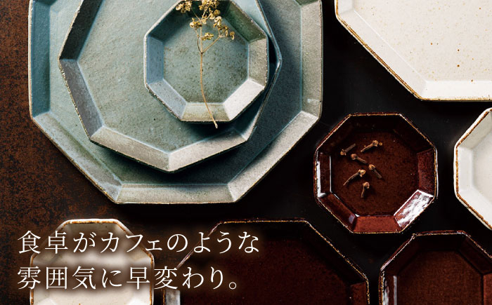 盛り付けるだけで気軽にカフェの雰囲気を演出します。工業的でシックな八角形のデザインに、やわらかな土の風合いが感じられる、存在感のある器。