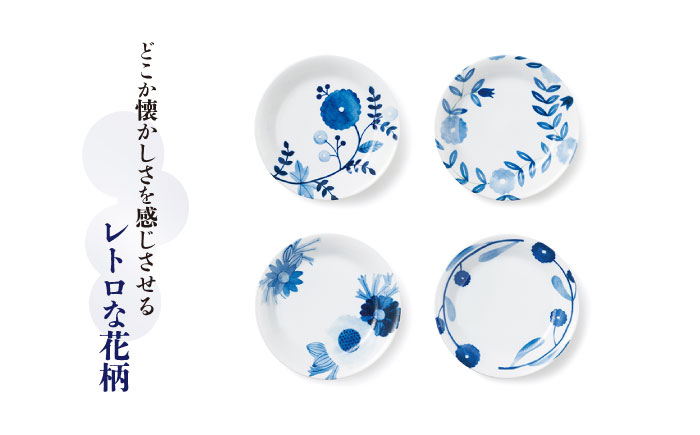 藍色の濃淡感じる繊細で柔らかなタッチで施されたお花のデザインは、どこか懐かしさを感じさせる、レトロかわいい印象です。