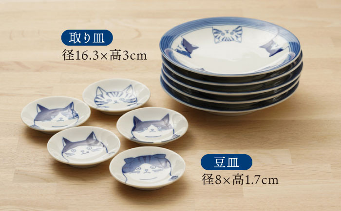 5種類の可愛い猫ちゃん柄の取り皿(16.3cm)・豆皿(8cm) 各5枚 合計10枚セットでお届け致します。
