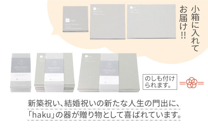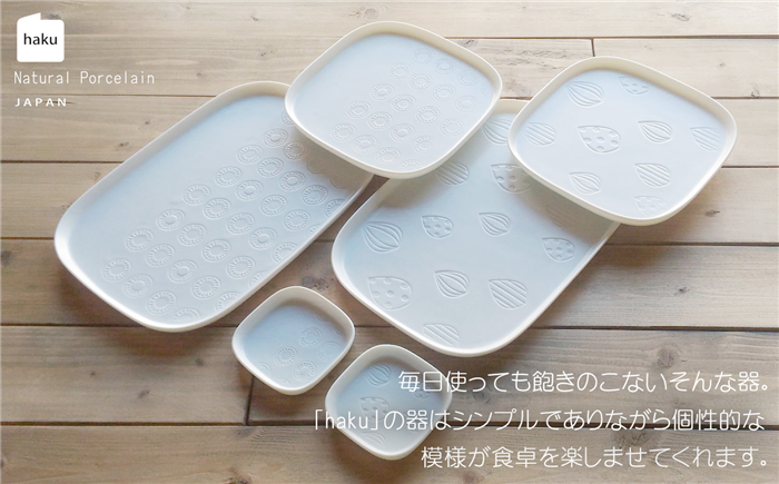 どんな料理にも合いやすく、シンプルだけどどこかかわいい毎日使っても飽きのこないそんな器を作りたい。「haku」の器はシンプルでありながら個性的な模様が食卓を楽しませてくれる。素材感にもこだわり、上質な白い生地を使っています。キメ細かくしっとりとした手触りも特徴のひとつです。少し角丸な形とサイズ感で使い心地を追求し、日常のいろいろなシーンで活躍します。また素材感にもごだわっています。器は手に取るものだから、手から伝わる感覚も大切にしたい。「haku」は素材感のある上質な白い器です。キメ細かくしっとりとした手触りもお楽しみ頂けます。新築祝い、結婚祝いなど新たな人生の門出に、「haku」のまっさらで上品な白い器が贈り物として喜ばれています。