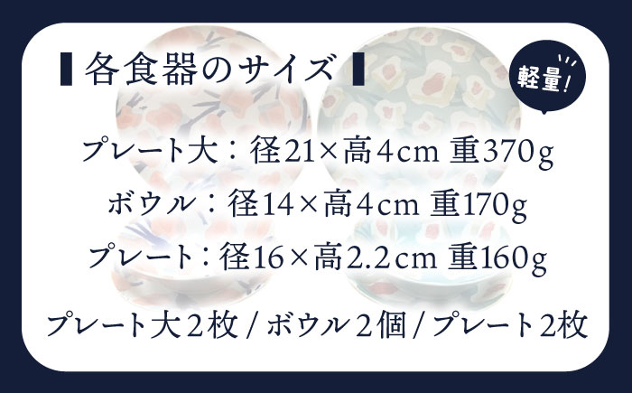 | 容量 | プレート大 径21x高4cm 重370g 2枚 ボウル 径14x高4cm 重170g 2個 プレート 径16x高2.2cm 重160g 2枚 磁器 【対応機器】 電子レンジ○ / オーブン× / 食器洗浄機○ 【お申し込み前に必ずお読みください】 お届けする返礼品には個体差が生じる場合があります。下部記載の「個体差について」、「破損・欠陥について」を必ずご一読のうえ、お申し込みください。 【色について】 商品写真はできる限り実物の色に近づけるよう徹底しておりますが、 お使いのモニター設定、お部屋の照明等により実際の商品と色味が異なる場合がございます。【原料原産地】土岐市産 |