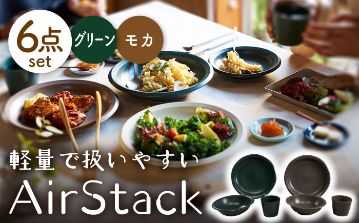 軽量食器・重なりやすい 【美濃焼】AirStack プレートL・ボウルM・フリーカップ 2色セット(グリーン&モカ)【丸利玉樹利喜蔵商店】食器 皿 鉢 [MCC032]