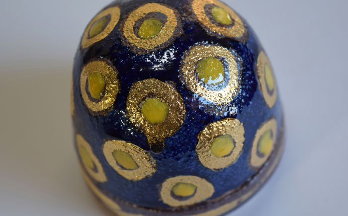 この作品は古くから受け継ぐ赤絵付伝統技法で、手間をかけてその上、完成までに、窯に5回程入れて焼き上げました。 デザインも全体を包み込む様に「緑色・金色・赤色・黄色・紺色」と縁起の良い「五彩」として趣向を凝らして高価な金を使用して美しい極彩色で一段と金が輝き、土が宝石の輝きを身に着け生まれ変わり…女性の手仕事の結晶から誕生した逸品です。 お香の文化は仏教と共に日本に伝わり発展し、昨今では疲れた心を癒し浄化してくれる香りです。 私のかわいい宝石「陶箱」と一緒に、心に潤いと楽しい時を迎えてください。 令和4年2月25日 博山窯 安藤晃子